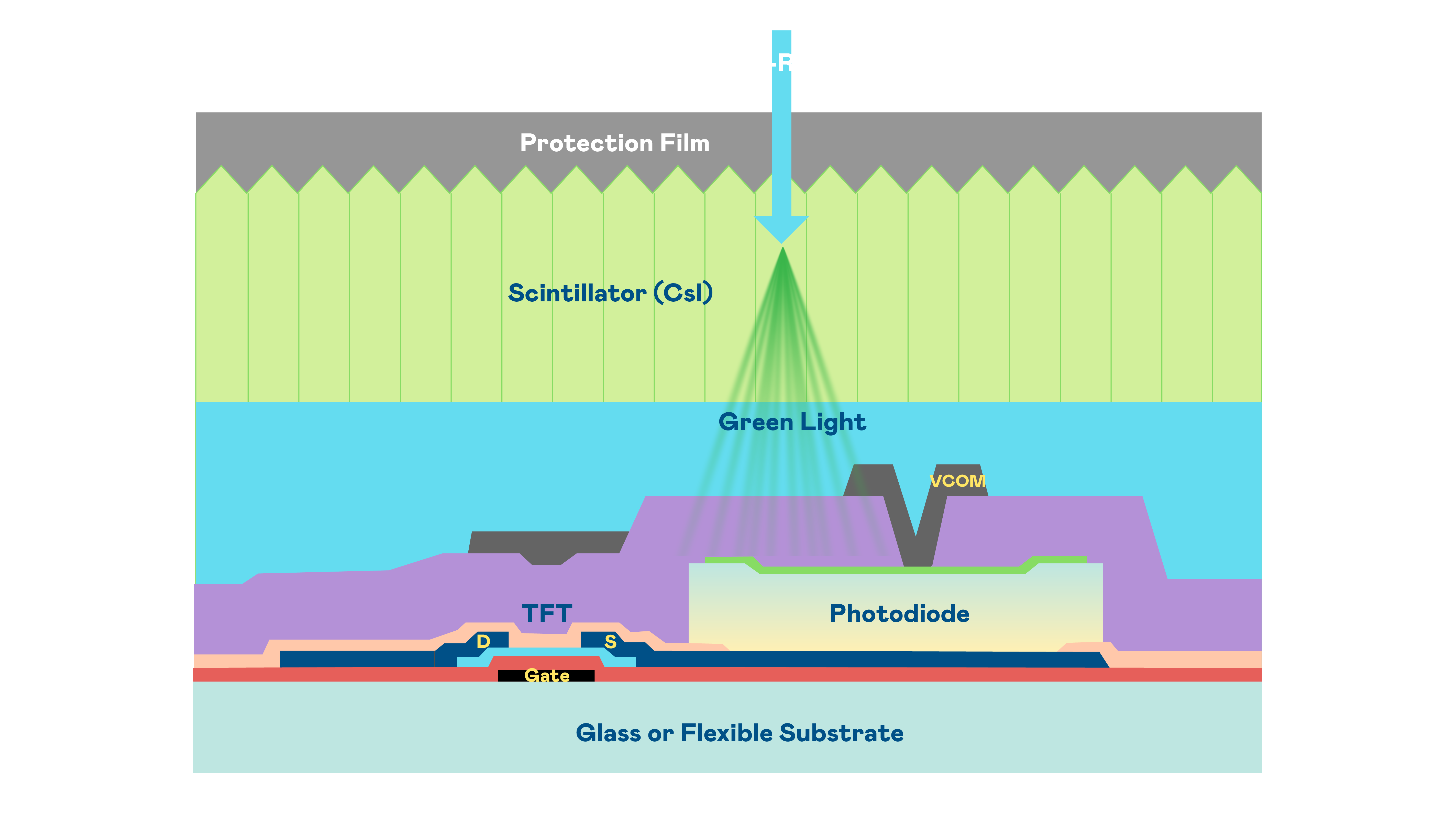 优游ub8国际的X光影像感测阵列使用薄膜电晶体 (TFT) 作为每个像素的读取开关,搭配光电二极体(Photodiode)的光电转换元件,用以感测X光影像讯号。